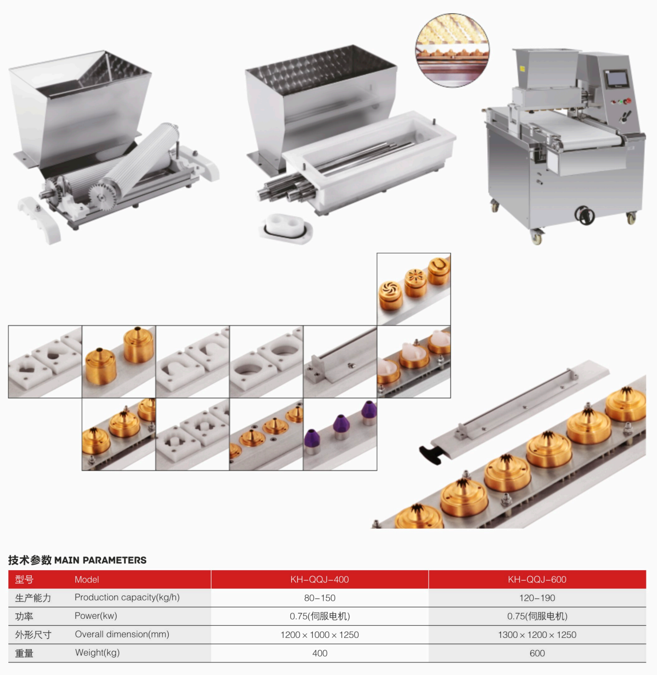 The PLC cookies machine is the new kind of cookie shapes forming machine, which are automatically controlled. You can set the cookie forming ways (depositing or wire cutting), working speed, space between cookies, etc by touch screen.