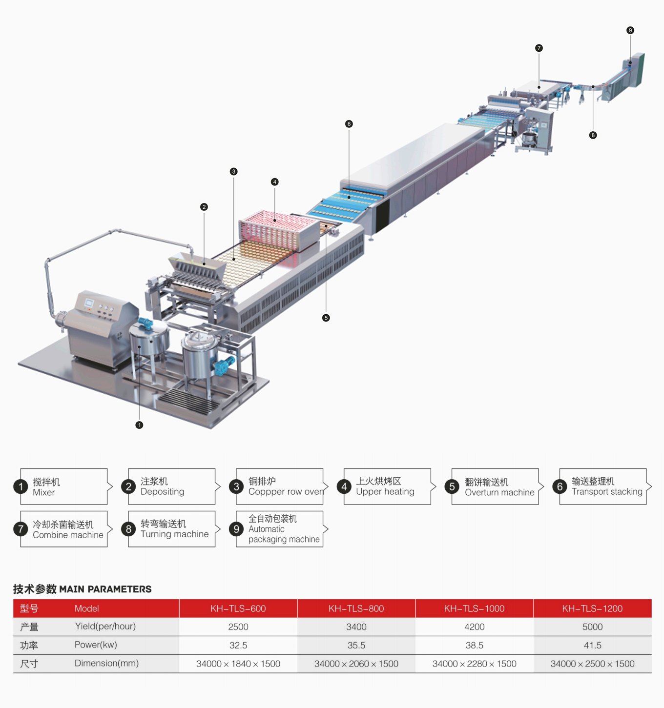 The whole production line is controlled by computer programming, and the automatic production line device autocratically rub grease, blanking and forming, gas-heated copper plate baking, precise filling, turning over cake and transfer process in an orderly manner. Every link is automatic processing.automatic control production, high automation level, production efficiency is greatly improved, and the produced Gong Yake quality and taste are good.