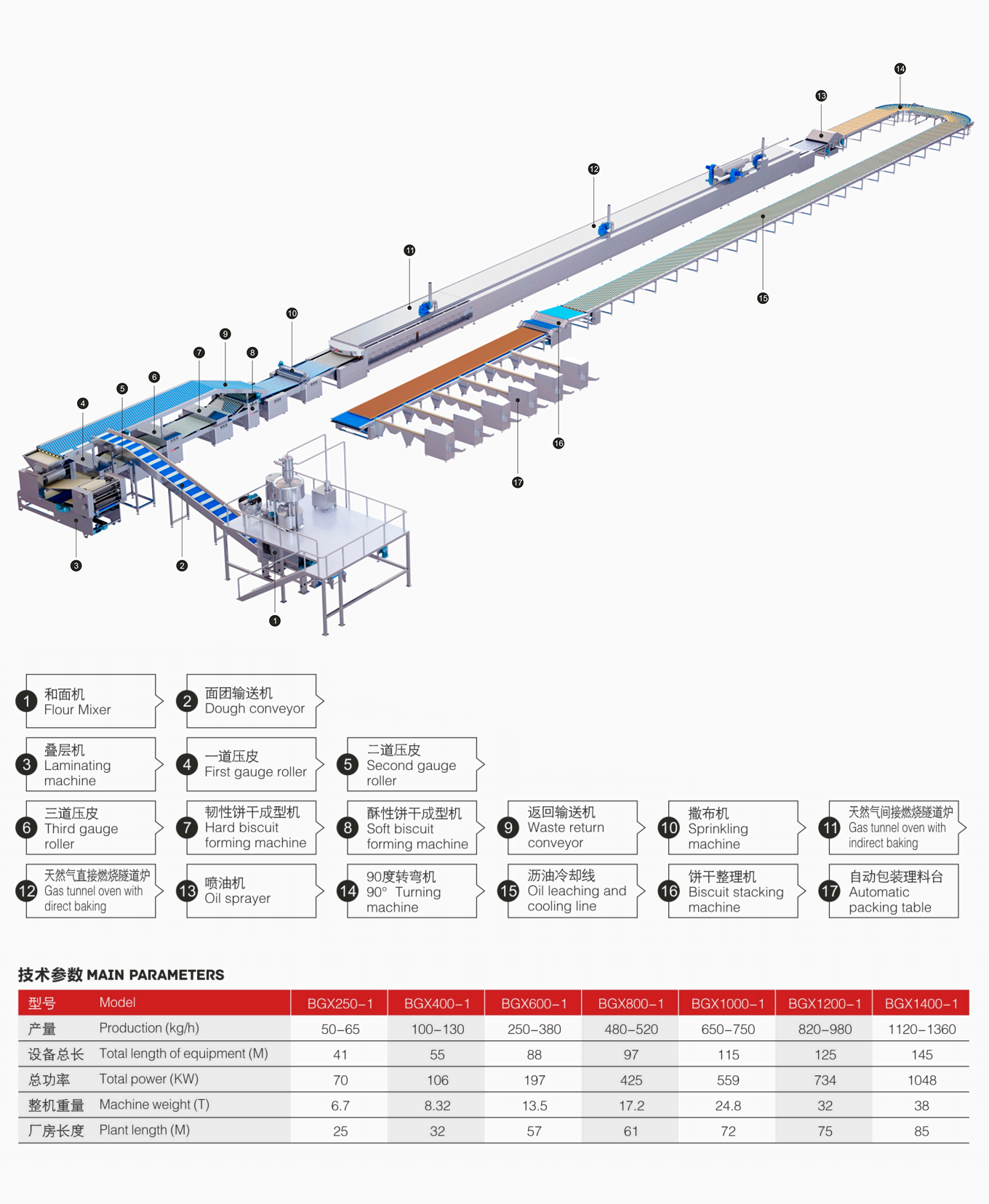 Different types of ovens can be selected depending on customer conditions: Electric heating, natural gas, liquefied gas and diesel burning furnace are divided into crispy, tough, soda, bear biscuits,cookies and other varieties according to the formula of biscuits. This equipment is a crisp, tough biscuit production line. The main process is: according to the formula flour. The dough mixer is added to the laminating machine and then enters the laminating machine. The laminating machine enters the first two rolls, the second to the third two rolls are formed by the roll cutting printing, and then enter the oven baking,and the baking temperature control is a very critical process, which is mainly divided into three processes: shaping,baking and coloring. Then enter the surface of the injector to spray oil.It is cooled by a cooling line and finally packaged by a packaging machine.